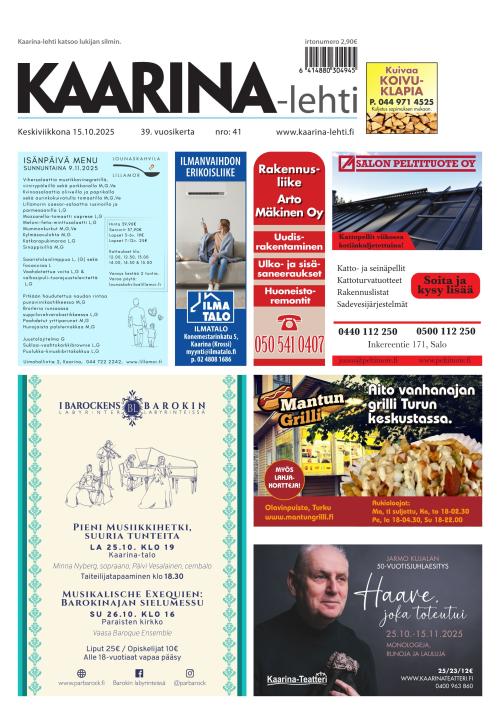 Kaarina-lehti on tehty uutisista, arjen puheenaiheista, iloisista ihmisistä, kaarinalaisista jutuista ja ohittamattomista tarjouksista ja tapahtumista.
