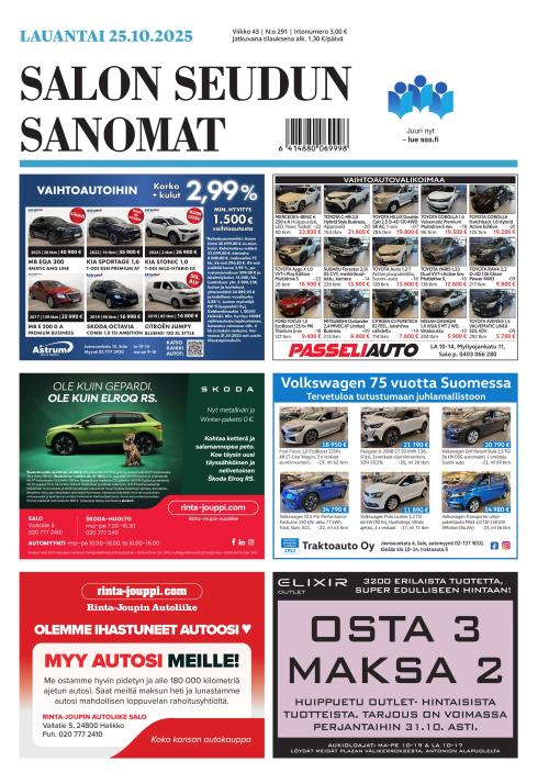 Salon Seudun Sanomat tuo Salon ja lähialueen uutiset, tarinat ja tapahtumat luoksesi joka päivä. Meille on tärkeää pitää sinut ajan tasalla paikallisista asioista, mutta myös suuremmista valtakunnallisista ja kansainvälisistä aiheista. Digisisältöjen tilaajana saat rajattoman pääsyn verkkosivuillemme, joka päivä ilmestyvään näköislehteen, SSS sovellukseen sekä kattavaan lehtiarkistoon jo ilmestyneitä numeroita, alkaen jopa vuodesta 1919. (Huom. laaja lehtiarkisto ei ole veloituksetta suoraan Lehtiluukusta ostaneiden käytössä.)
