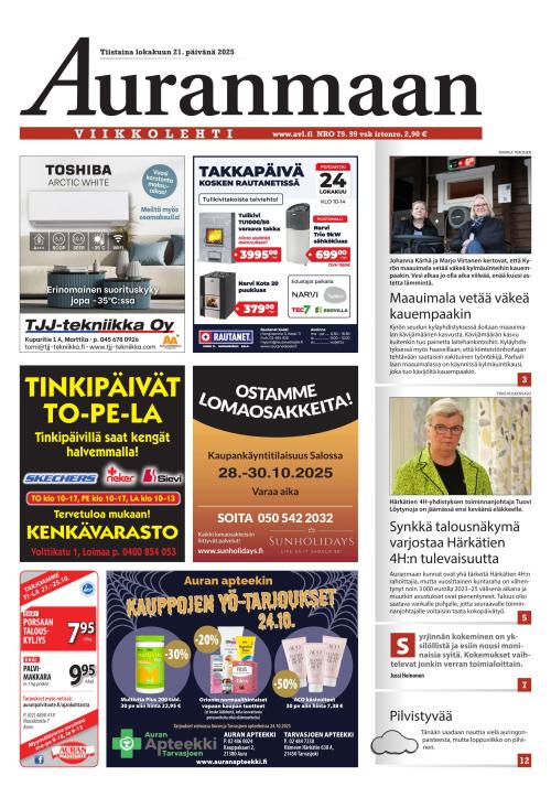 Auranmaan Viikkolehti on puoluepoliittisesti sitoutumaton, elämää ja uutisia monipuolisesti ja ihmisläheisesti valottava paikallislehti. Ilmestymme tiistaisin ja perjantaisin.