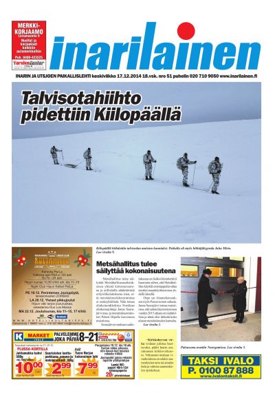 Inarilainen on Inarin ja Utsjoen oma paikallislehti sekä alueen luetuin ja luotetuin media. Paikallislehti on mainoskanava, joka tavoittaa tehokkaimmin alueen kuluttajat ja yritykset. Printtilehti ilmestyy kerran viikossa ja digitaalinen versio mahdollistaa tuoreiden uutisten seuraamisen missä tahansa oletkin.