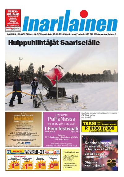 Inarilainen on Inarin ja Utsjoen oma paikallislehti sekä alueen luetuin ja luotetuin media. Paikallislehti on mainoskanava, joka tavoittaa tehokkaimmin alueen kuluttajat ja yritykset. Printtilehti ilmestyy kerran viikossa ja digitaalinen versio mahdollistaa tuoreiden uutisten seuraamisen missä tahansa oletkin.