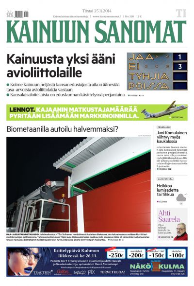 Kainuun Sanomat on elinvoimainen ja monipuolinen maakuntalehti. Tuttavallisemmin “Kainariksi” kutsuttu maakuntalehti tarjoaa kattavan kokonaistavoittavuuden sekä vahvan digitaalisen saatavuuden, mikä tekee lehdestä vahvan kanavan alueen tiedonvälityksessä. Kainuun Sanomat on koko Kainuun ääni, joka on ollut osana luomassa maakunnalle omaa identiteettiä.