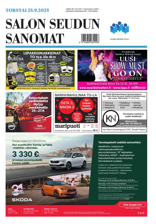 Salon Seudun Sanomat tuo Salon ja lähialueen uutiset, tarinat ja tapahtumat luoksesi joka päivä. Meille on tärkeää pitää sinut ajan tasalla paikallisista asioista, mutta myös suuremmista valtakunnallisista ja kansainvälisistä aiheista. Digisisältöjen tilaajana saat rajattoman pääsyn verkkosivuillemme, joka päivä ilmestyvään näköislehteen, SSS sovellukseen sekä kattavaan lehtiarkistoon jo ilmestyneitä numeroita, alkaen jopa vuodesta 1919. (Huom. laaja lehtiarkisto ei ole veloituksetta suoraan Lehtiluukusta ostaneiden käytössä.)