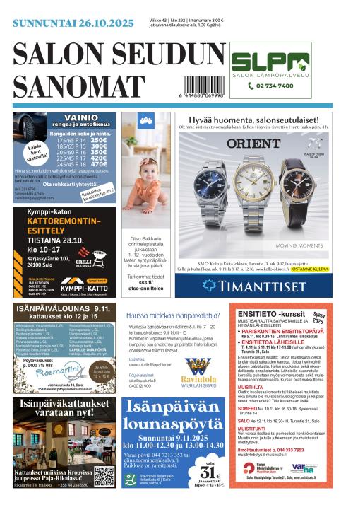 Salon Seudun Sanomat tuo Salon ja lähialueen uutiset, tarinat ja tapahtumat luoksesi joka päivä. Meille on tärkeää pitää sinut ajan tasalla paikallisista asioista, mutta myös suuremmista valtakunnallisista ja kansainvälisistä aiheista. Digisisältöjen tilaajana saat rajattoman pääsyn verkkosivuillemme, joka päivä ilmestyvään näköislehteen, SSS sovellukseen sekä kattavaan lehtiarkistoon jo ilmestyneitä numeroita, alkaen jopa vuodesta 1919. (Huom. laaja lehtiarkisto ei ole veloituksetta suoraan Lehtiluukusta ostaneiden käytössä.)
