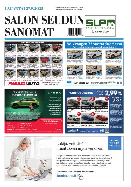 Salon Seudun Sanomat tuo Salon ja lähialueen uutiset, tarinat ja tapahtumat luoksesi joka päivä. Meille on tärkeää pitää sinut ajan tasalla paikallisista asioista, mutta myös suuremmista valtakunnallisista ja kansainvälisistä aiheista. Digisisältöjen tilaajana saat rajattoman pääsyn verkkosivuillemme, joka päivä ilmestyvään näköislehteen, SSS sovellukseen sekä kattavaan lehtiarkistoon jo ilmestyneitä numeroita, alkaen jopa vuodesta 1919. (Huom. laaja lehtiarkisto ei ole veloituksetta suoraan Lehtiluukusta ostaneiden käytössä.)