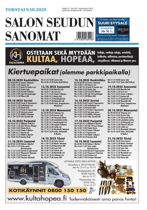 Salon Seudun Sanomat tuo Salon ja lähialueen uutiset, tarinat ja tapahtumat luoksesi joka päivä. Meille on tärkeää pitää sinut ajan tasalla paikallisista asioista, mutta myös suuremmista valtakunnallisista ja kansainvälisistä aiheista. Digisisältöjen tilaajana saat rajattoman pääsyn verkkosivuillemme, joka päivä ilmestyvään näköislehteen, SSS sovellukseen sekä kattavaan lehtiarkistoon jo ilmestyneitä numeroita, alkaen jopa vuodesta 1919. (Huom. laaja lehtiarkisto ei ole veloituksetta suoraan Lehtiluukusta ostaneiden käytössä.)
