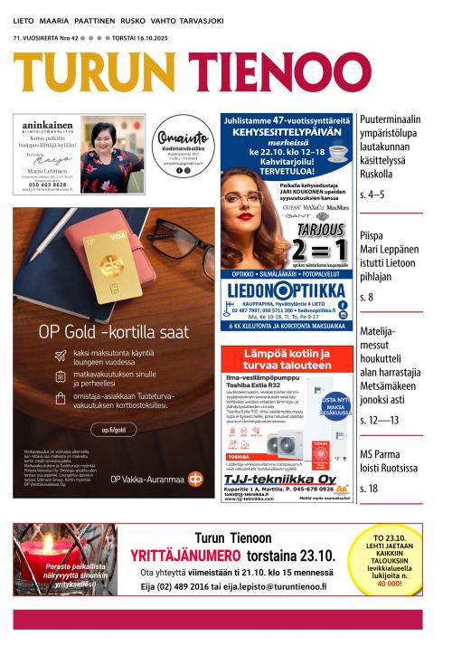 Turun Tienoo on kerran viikossa torstaisin Liedossa, Ruskolla ja Turun pohjoisissa kaupunginosissa ilmestyvä puolueeton paikallislehti. Turun Tienoo on alueensa luetuin lehti ja tutkitusti tehokas ilmoitusväline. Alueen uutistarjonta välitetään sekä painetussa lehdessä että näköislehdessä ja verkkosivuilla. Olemme myös Facebookissa.