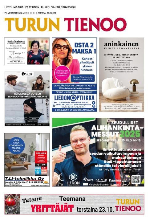 Turun Tienoo on kerran viikossa torstaisin Liedossa, Ruskolla ja Turun pohjoisissa kaupunginosissa ilmestyvä puolueeton paikallislehti. Turun Tienoo on alueensa luetuin lehti ja tutkitusti tehokas ilmoitusväline. Alueen uutistarjonta välitetään sekä painetussa lehdessä että näköislehdessä ja verkkosivuilla. Olemme myös Facebookissa.
