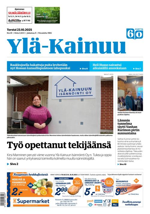 Lue Ylä-Kainuusta tiistaisin ja torstaisin pohjoisen Kainuun merkittävimmät uutiset ja tuoreimmat kuulumiset. Paikallislehti rakentaa yhdessä lukijoidensa ja muiden yhteistyökumppaneidensa kanssa alueen hyvää huomista. Ylakainuu.fi elää ajassa!