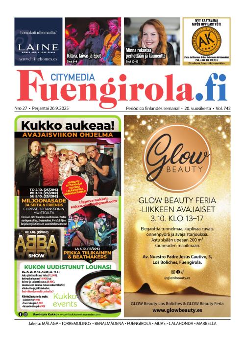 Fuengirola.fi on kaupunkilehti Espanjan Aurinkorannikolla asuville suomalaisille ja siellä vieraileville turisteille. Lehteä lukemalla tiedät kaiken oleellisen alueesta, pysyt kärryillä uutisista ja tiedät missä tapahtuu. Lehti on luettavissa netissä joka torstai-ilta, paperiversio löytyy Aurinkorannikolta perjantaisin.