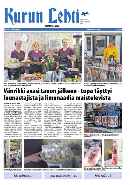 Kurun Lehti on vuonna 2009 perustettu puolueeton ja sitoutumaton kotiseutu- ja paikallislehti, joka ilmestyy torstaisin. Kerromme lukijoillemme Ylöjärven ja Kurun tapahtumista ja muista maaseutua koskettavista ajankohtaisista asioista.Levikki on noin 1500.