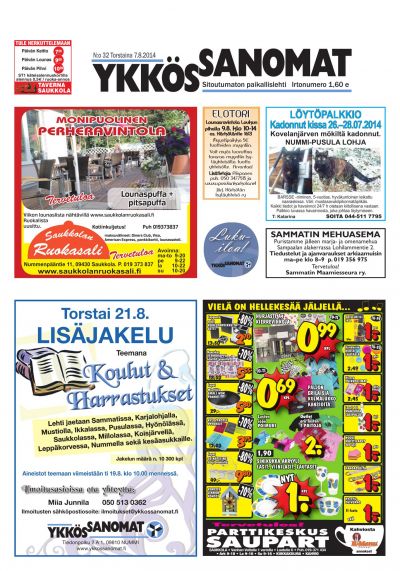 Ykkössanomat on myös alueensa vankka ilmoitusväline: koska paikallislehti luetaan moneen kertaan ja säilytetään usein seuraavan lehden ilmestymiseen saakka, ilmoituksetkin luetaan tarkkaan. Lehden ilmestymispäivä torstai on ilmoitusasiakkaidemme kannalta erinomainen: monesti perheet tekevät isommat ostoksensa yhdessä viikonloppuna.