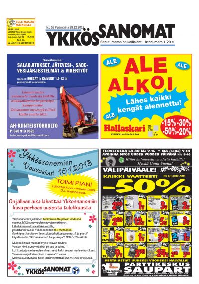 Ykkössanomat on myös alueensa vankka ilmoitusväline: koska paikallislehti luetaan moneen kertaan ja säilytetään usein seuraavan lehden ilmestymiseen saakka, ilmoituksetkin luetaan tarkkaan. Lehden ilmestymispäivä torstai on ilmoitusasiakkaidemme kannalta erinomainen: monesti perheet tekevät isommat ostoksensa yhdessä viikonloppuna.