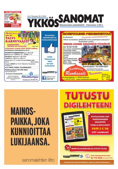 Ykkössanomat on myös alueensa vankka ilmoitusväline: koska paikallislehti luetaan moneen kertaan ja säilytetään usein seuraavan lehden ilmestymiseen saakka, ilmoituksetkin luetaan tarkkaan. Lehden ilmestymispäivä torstai on ilmoitusasiakkaidemme kannalta erinomainen: monesti perheet tekevät isommat ostoksensa yhdessä viikonloppuna.